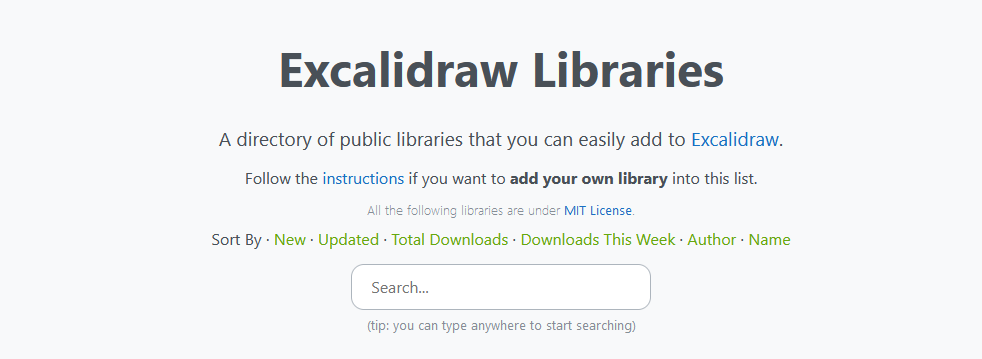 Cliccando su Browse libraries si viene reindirizzati sul catalaogo online di Excalidraw
