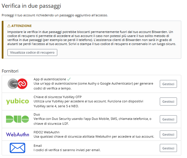Per poter blindare la cassaforte da accessi indesiderati oltre all'unica password da ricordare si può implementare la'autenticazione due fattori (2FA).