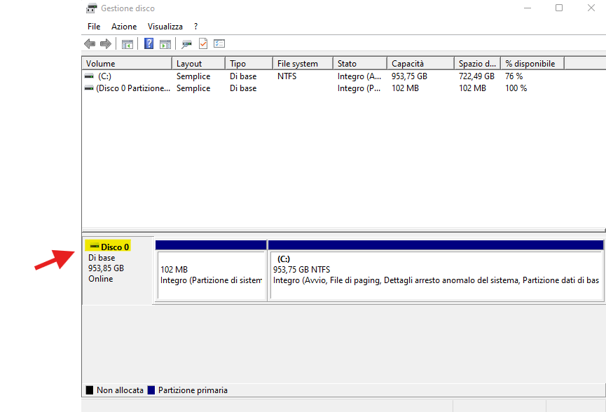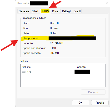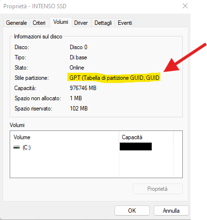 Se tutto è andato a buon fine rientrando in Gestione Disco e andando in Proprietà - Volumi del disco 0 troveremo