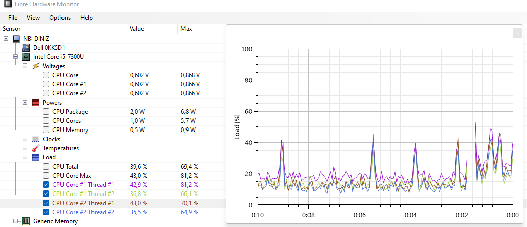 Al tra cosa interessante di questa applicazione è la possibilità di creare grafici in tempo reale con le componenti HW che ci interessano. Basta selezionare le componenti interessate ed il grafico comparirà come mostrato qui di seguito: