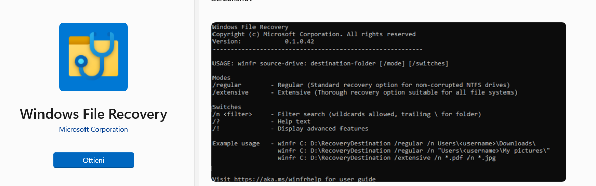 Andare nel Microsoft Store ed eseguire una ricerca tra le app presenti con i seguenti termini: "Windows File Recovery".